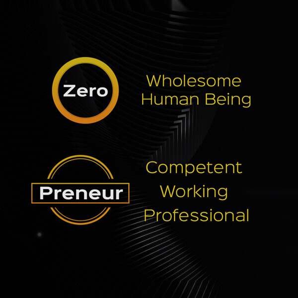 ZERO – means - Wholesome human beings. PRENEUR - means – Competent working professional. The reference to Zero here is not Zero as ‘nothing’, but Zero as the factor that gives value to even a Trillion.
